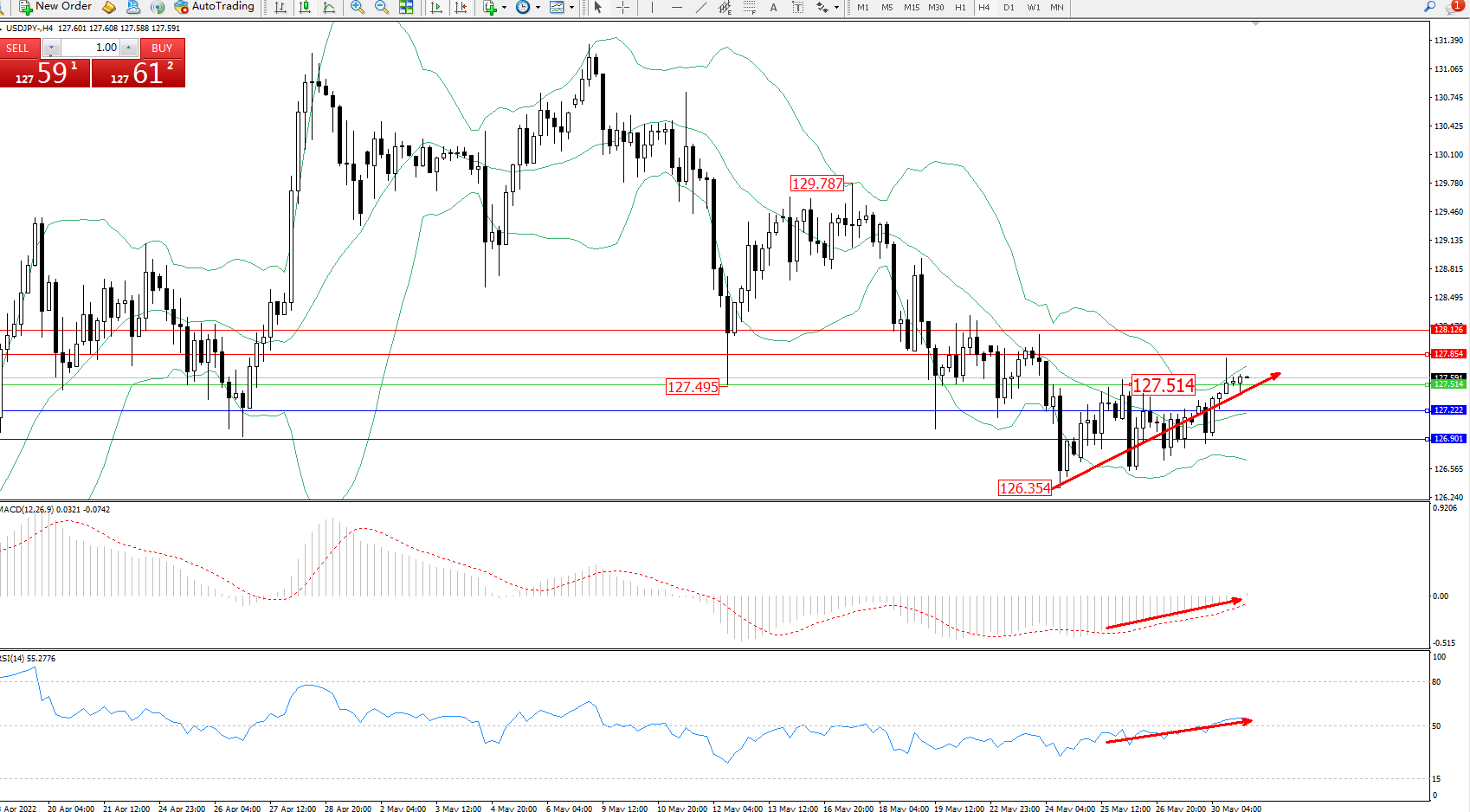 交易策略:127.514上方看涨,目标127.854、128.126
