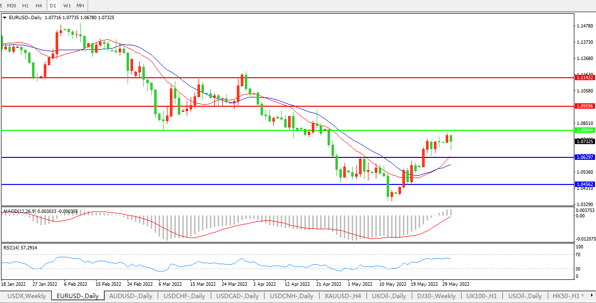 欧元目前仍疲弱,因周二数据显示欧元区5月通胀触及纪录高位,这加大了欧洲央行的压力,目前该行在抵御经济衰退的同时寻求在未来数月通过逐步升息来抑制高物价。