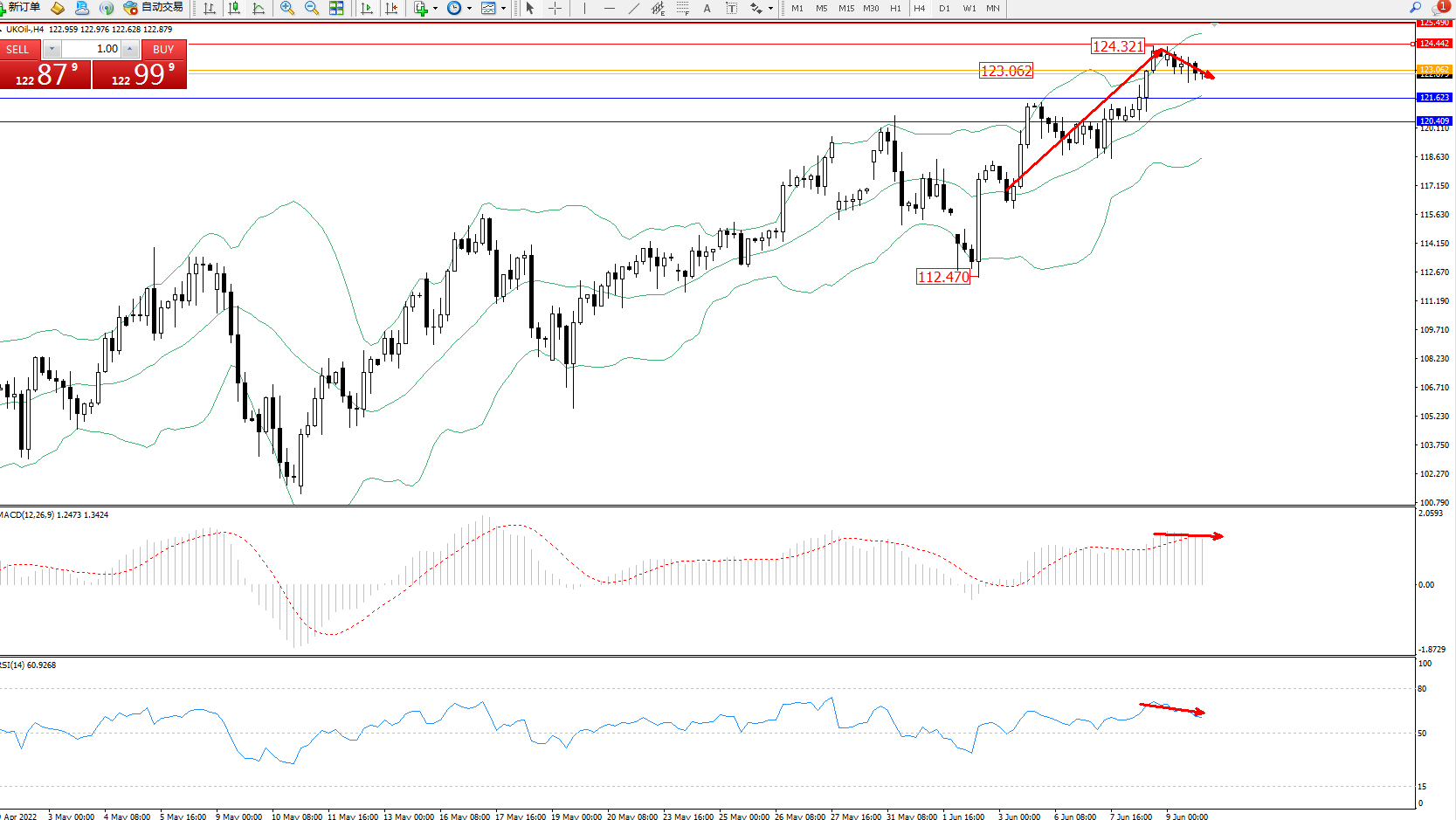交易策略:123.062下方看跌,目标121.623、120.409