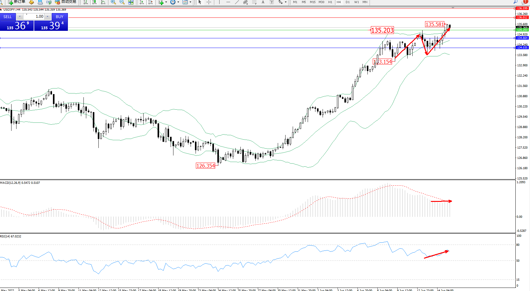 备选策略:135.203下方看跌,目标134.664、134.035
