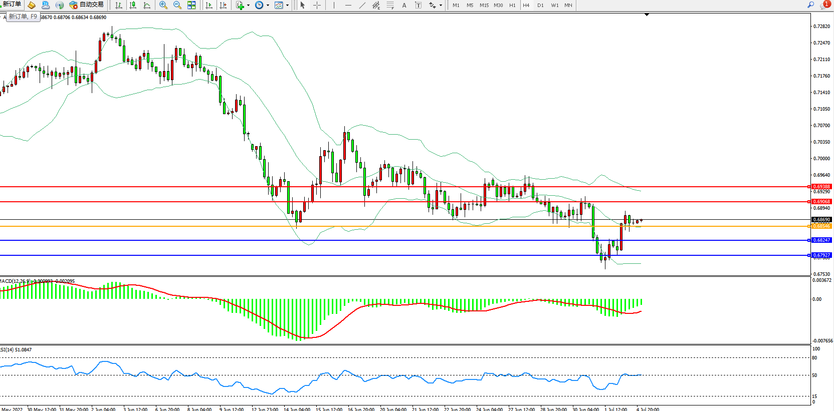 交易策略:0.68546上方看涨,目标0.69068、0.68388