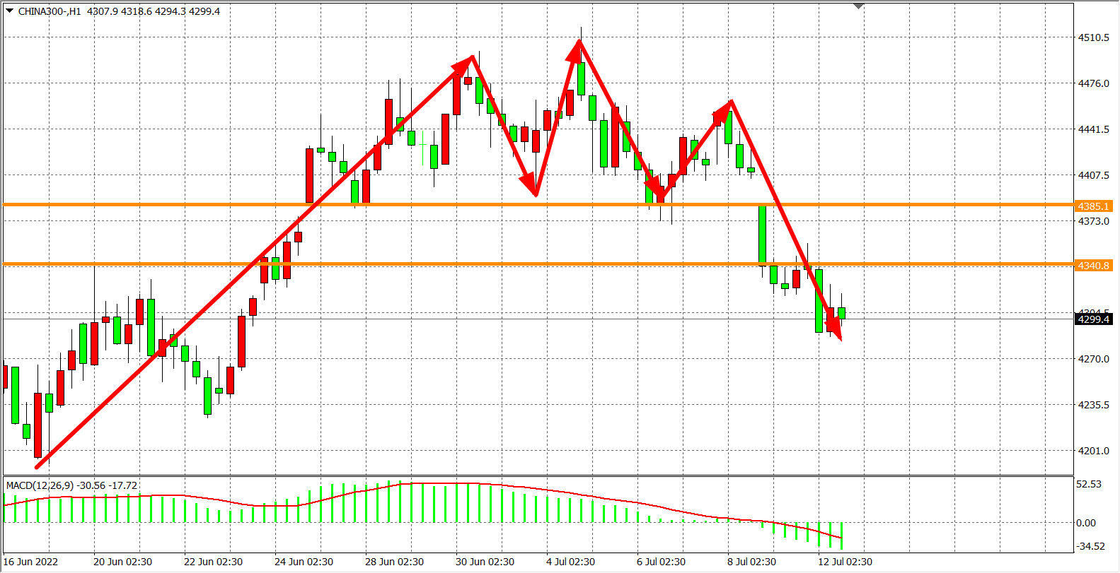 1小时图看,沪深300继续走回调,目前阻力已下移至4340,MACD于零轴之下开始放量,短线趋势顶部初现,行情走弱明显,日内在4340之下继续看回调,下方看4250-4200