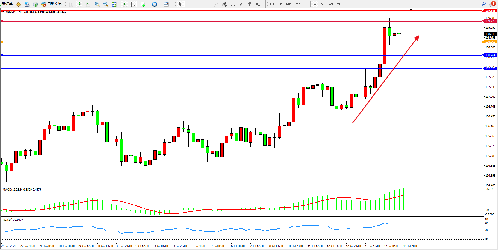 4小时图看:多头动力强势拉升上扬,高位短期整理,MACD指标处于多头区域高位整理上行,RSI指标处于高位80均衡线下侧徘徊;