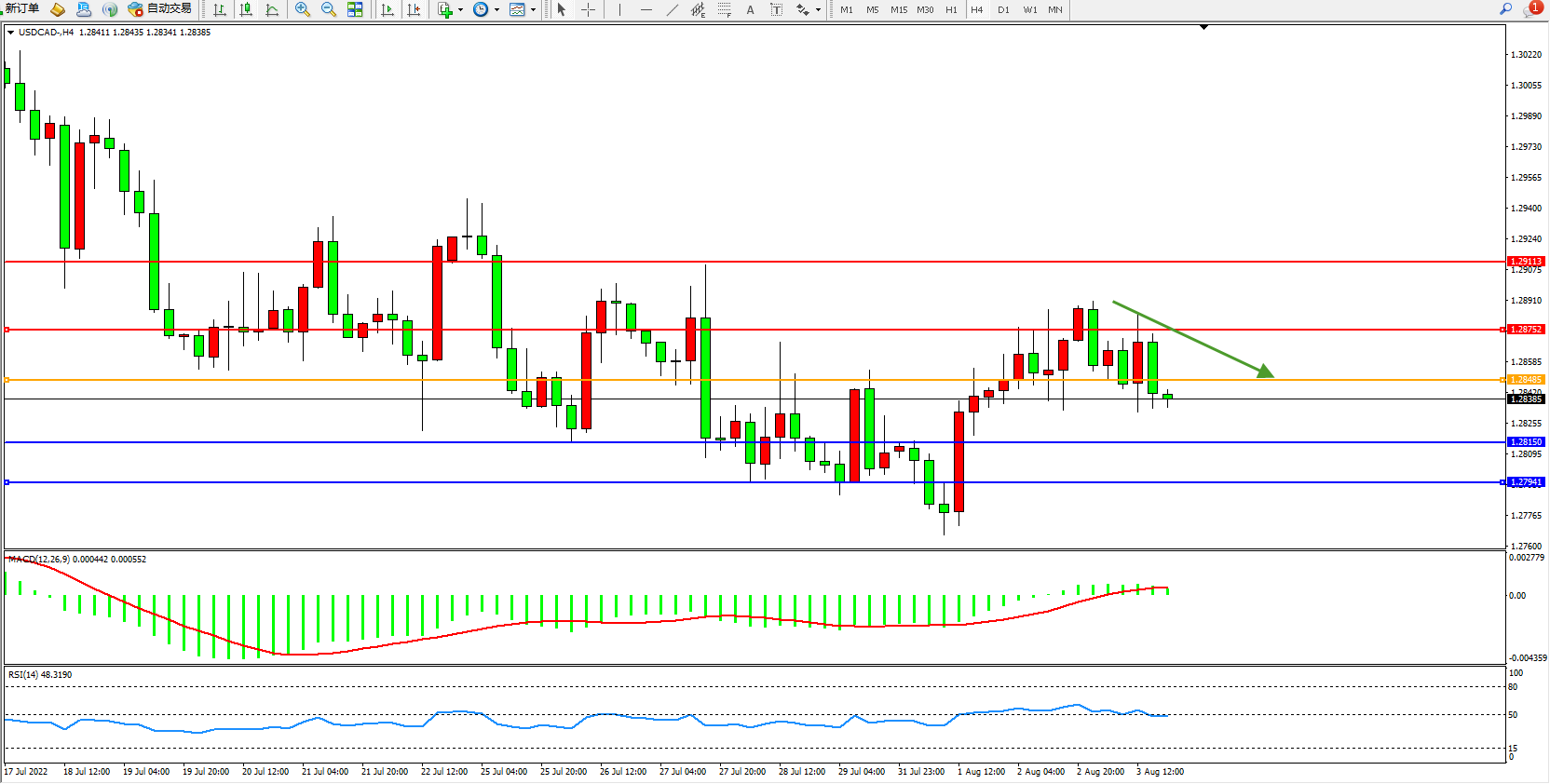 美元加元USDCAD——4小时K线图显示: