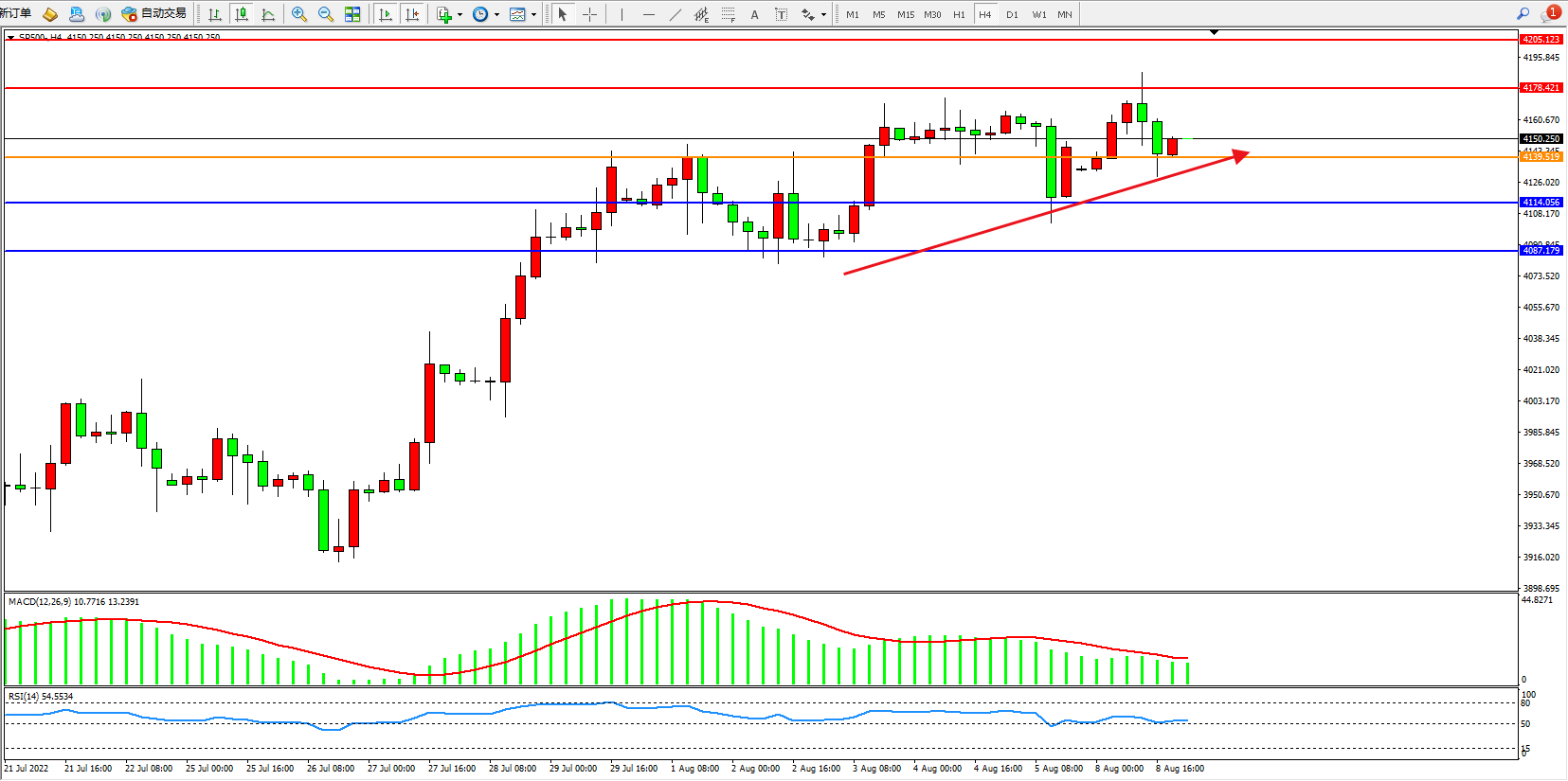 标普SP500——4小时K线图显示: