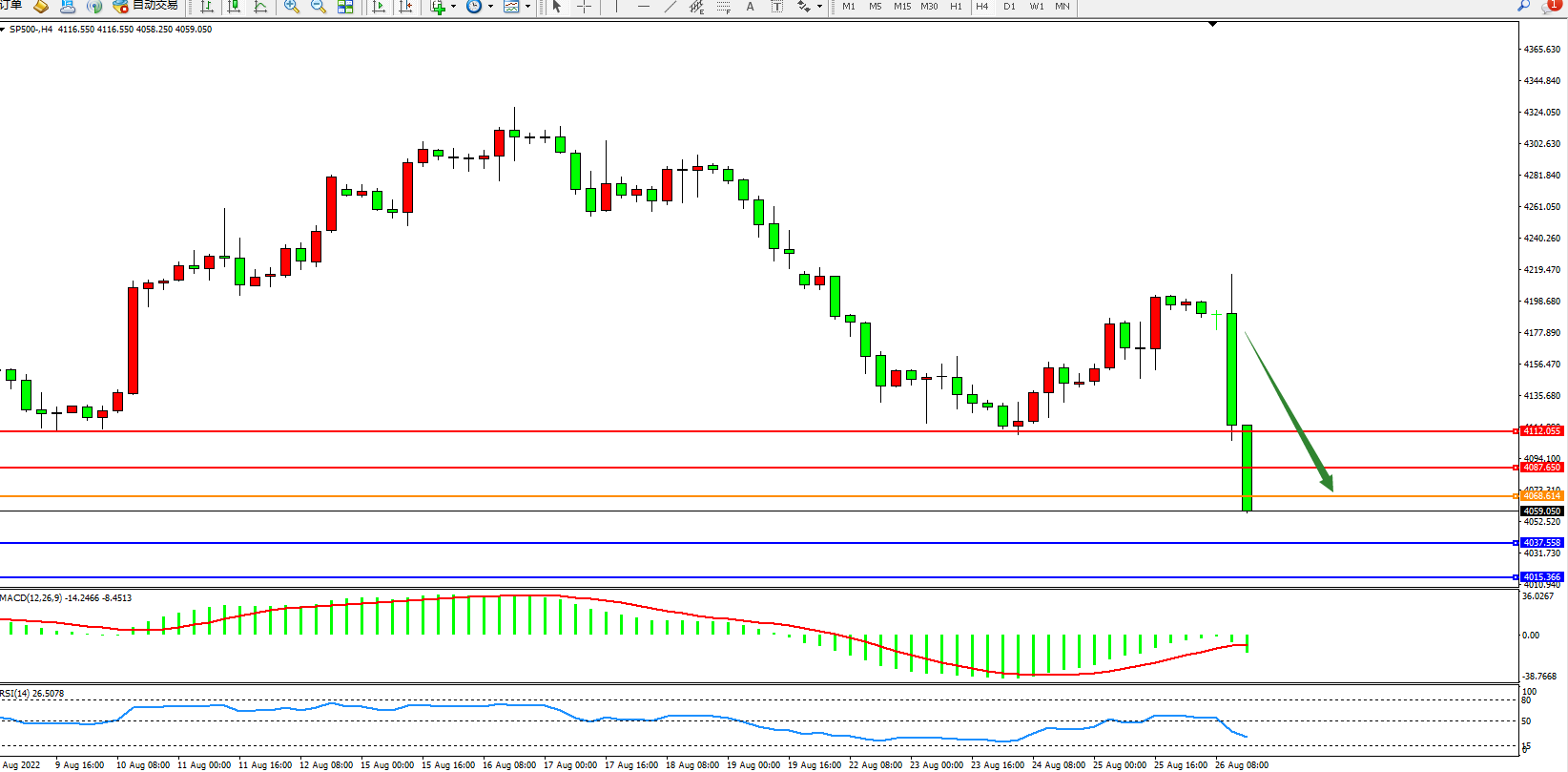 标普500指数8月26日(周五)收盘下跌139.58点,跌幅3.32%,报4059.54点;美联储主席鲍威尔反驳了华尔街的预期,即如果未来几年经济走弱,美联储可能会迅速逆转路线并降息。这种看法在7月至8月中旬推动了股市和其他资产的反弹。