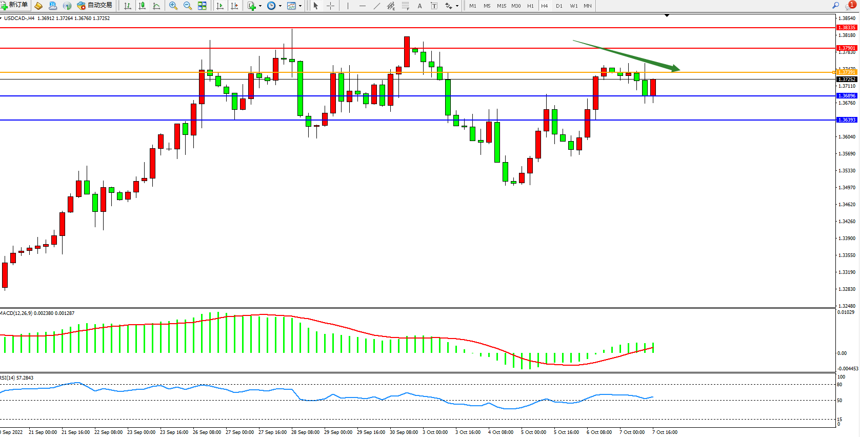美元加元USDCAD——4小时K线图显示: