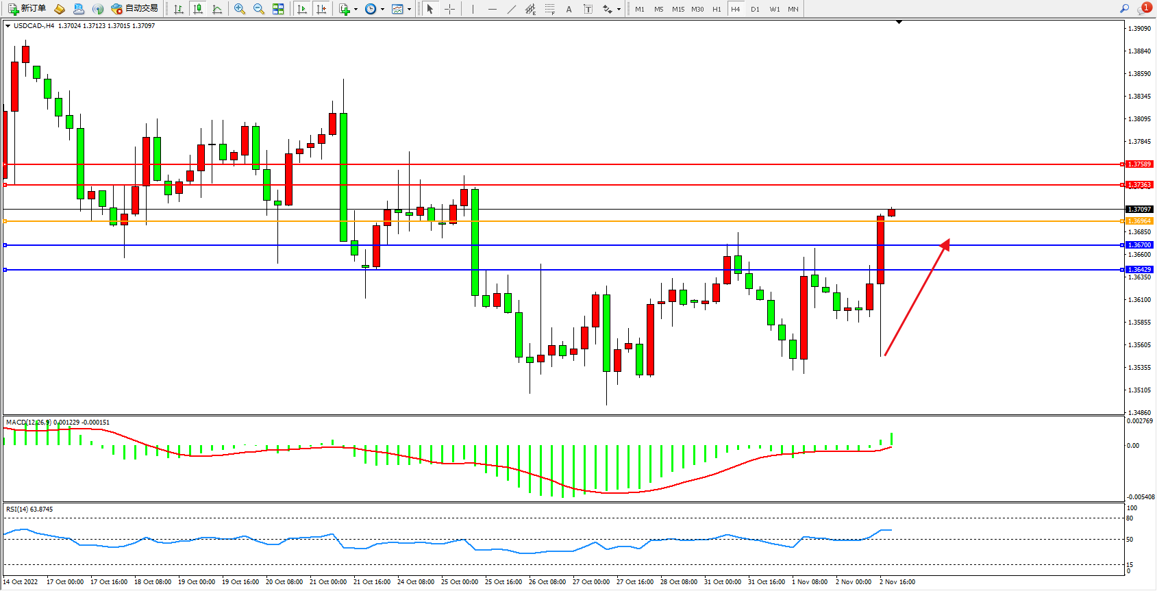 美元加元USDCAD——4小时K线图显示: