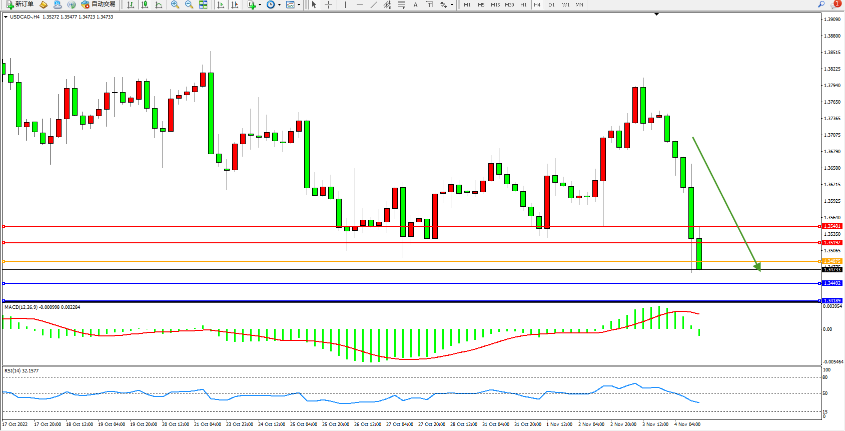 美元加元USDCAD——4小时K线图显示: