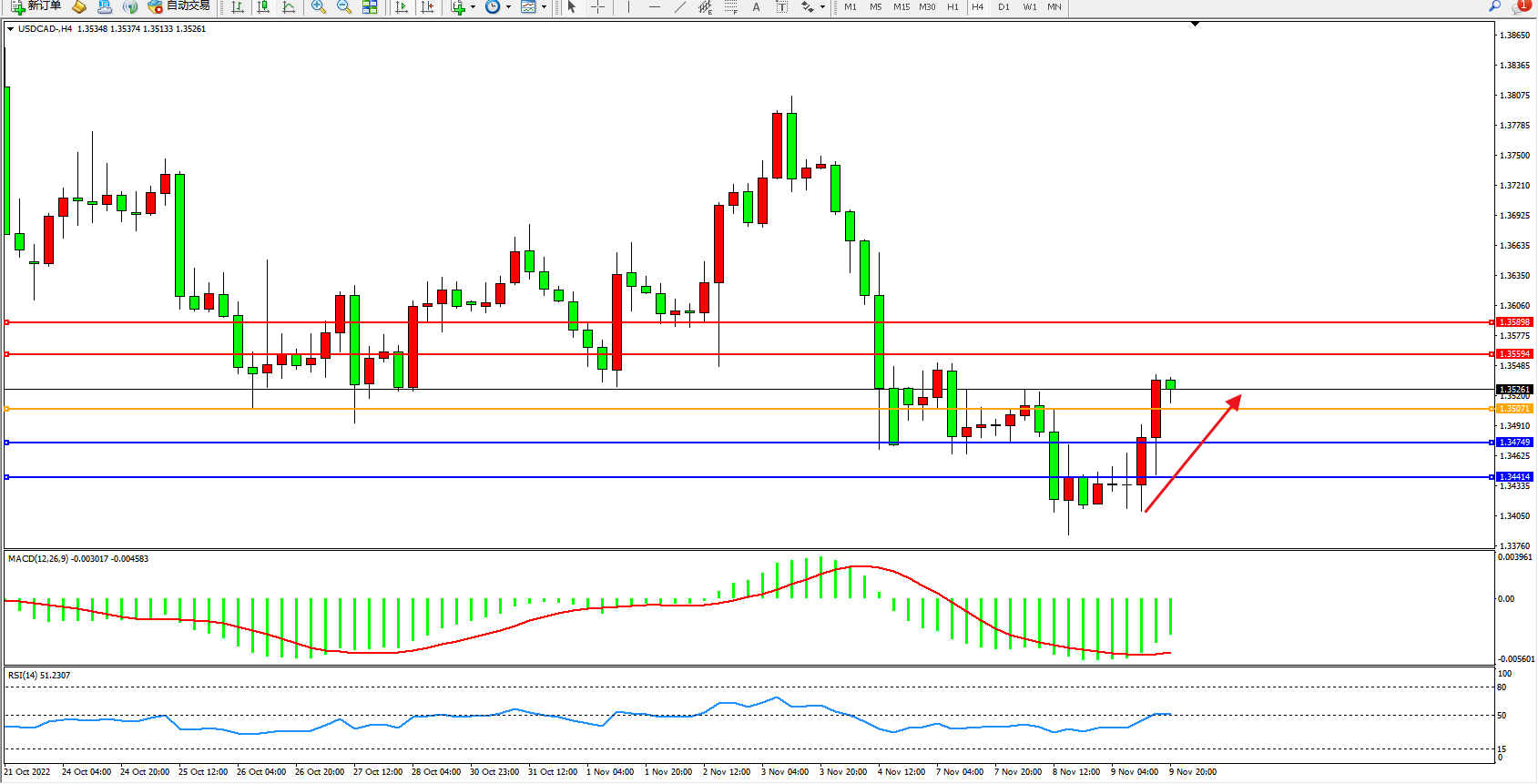 美元加元USDCAD——4小时K线图显示: