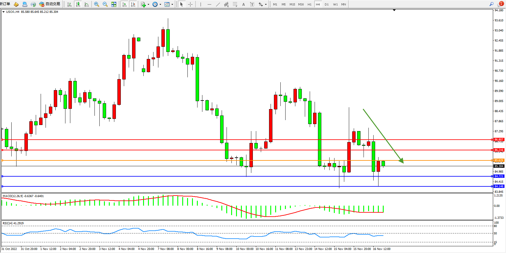 原油维持85.304附近震荡,EIA报告:美国至11月11日当周EIA原油库存 -540万桶,预期-44万桶,前值392.5万桶。俄克拉荷马州库欣原油库存 -162.4万桶,前值-92.3万桶。美国战略石油储备(SPR)库存减少410.0万桶至3.921亿桶,降幅1.03%。