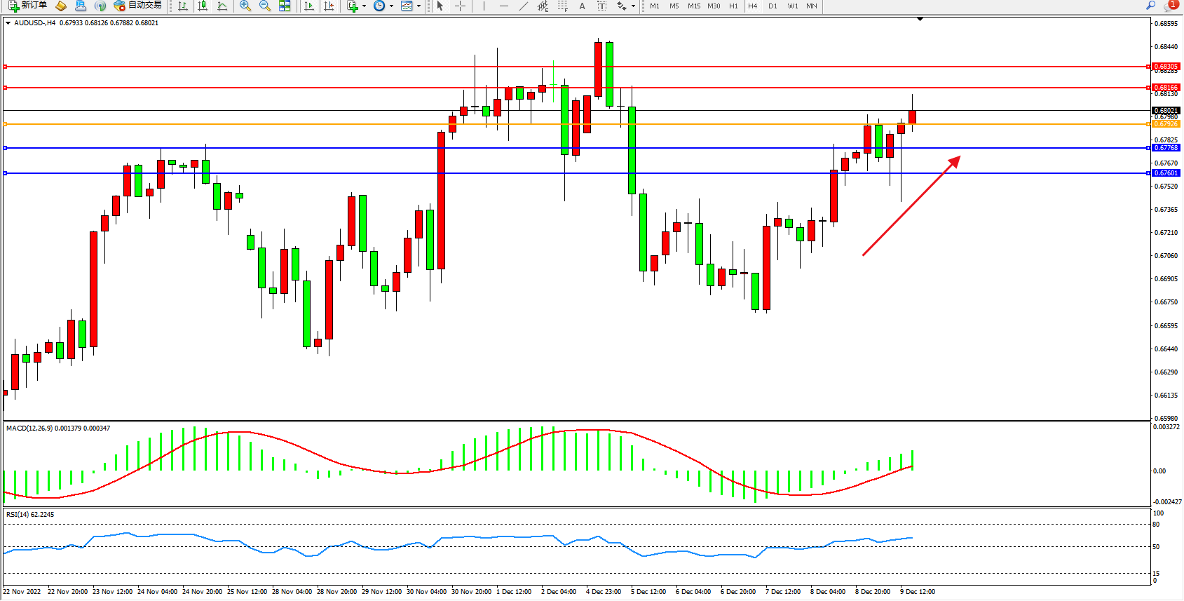 澳元美元AUDUSD——4小时K线图显示: