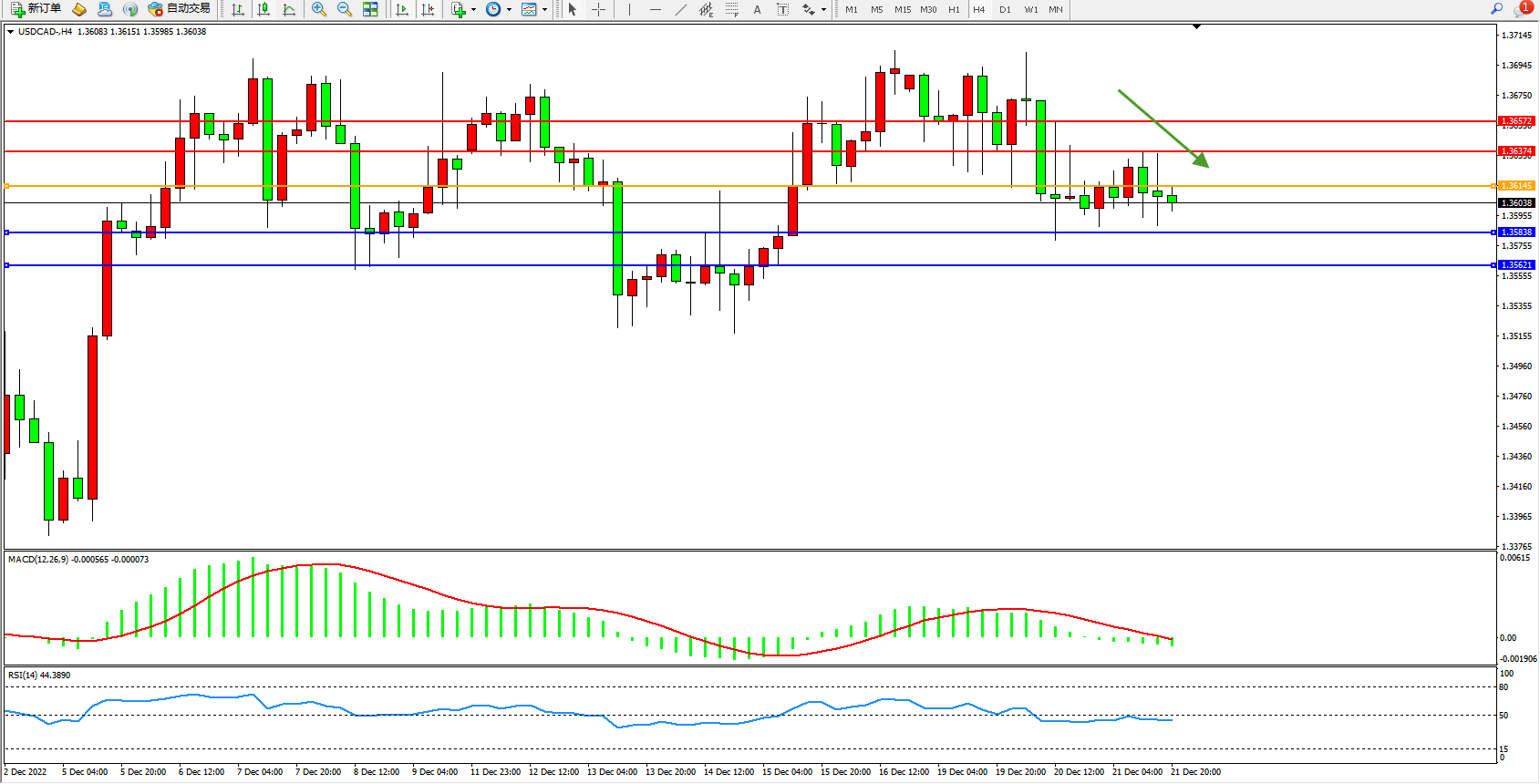美元加元USDCAD——4小时K线图显示:
