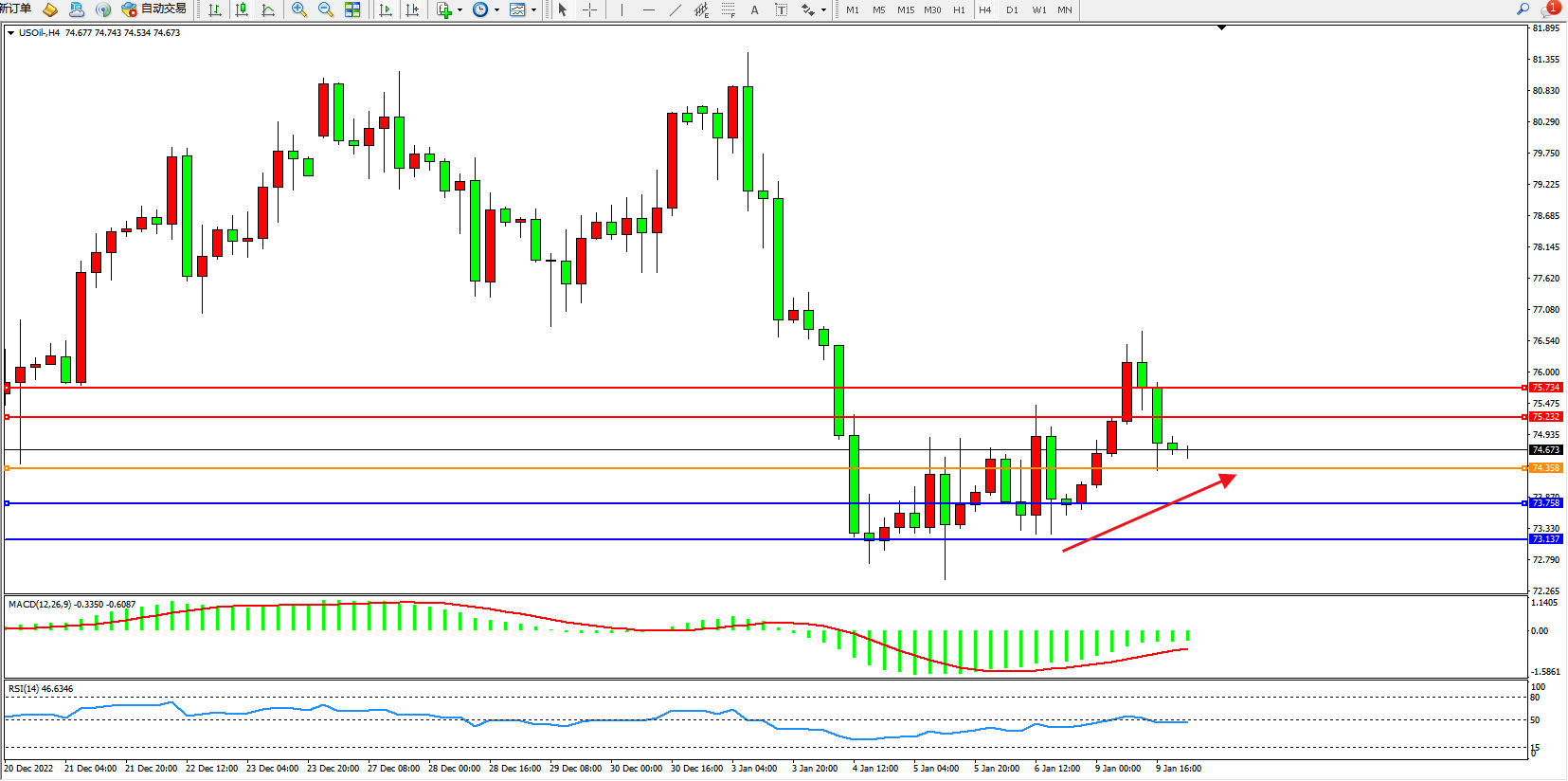 交易策略:74.358上方看涨,目标75.232、75.734