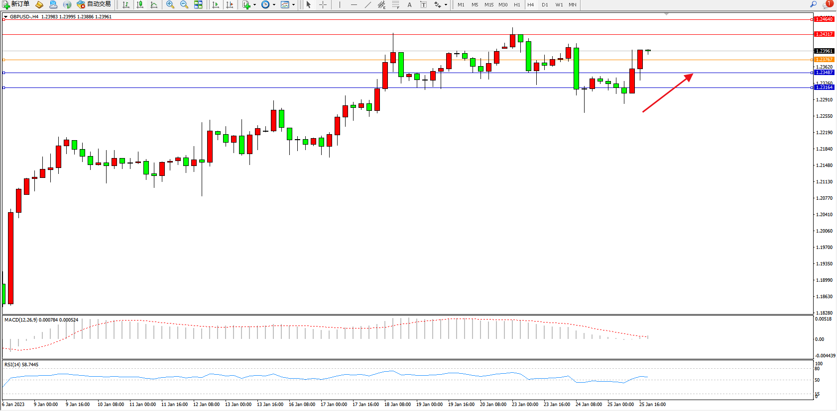 交易策略:1.23767上方看涨,目标1.24317、1.24640