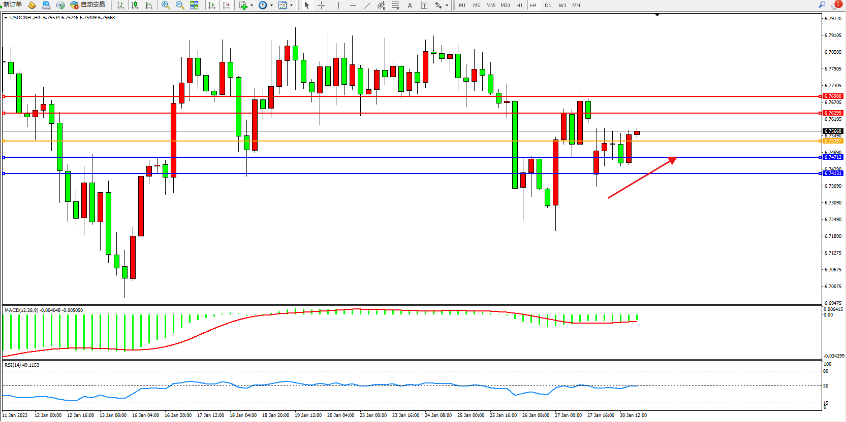 美元兑人民币维持6.75297附近震荡,春节期间中国旅游及出行数据表明,目前暂时低迷的旅游相关行业正迎来稳步复苏,中国2023年GDP增长预期由去年11月的4.5%上调至5.5%的预判。在世界经济持续下行的大背景下,中国有望成为今年全球增长的最大推动力。