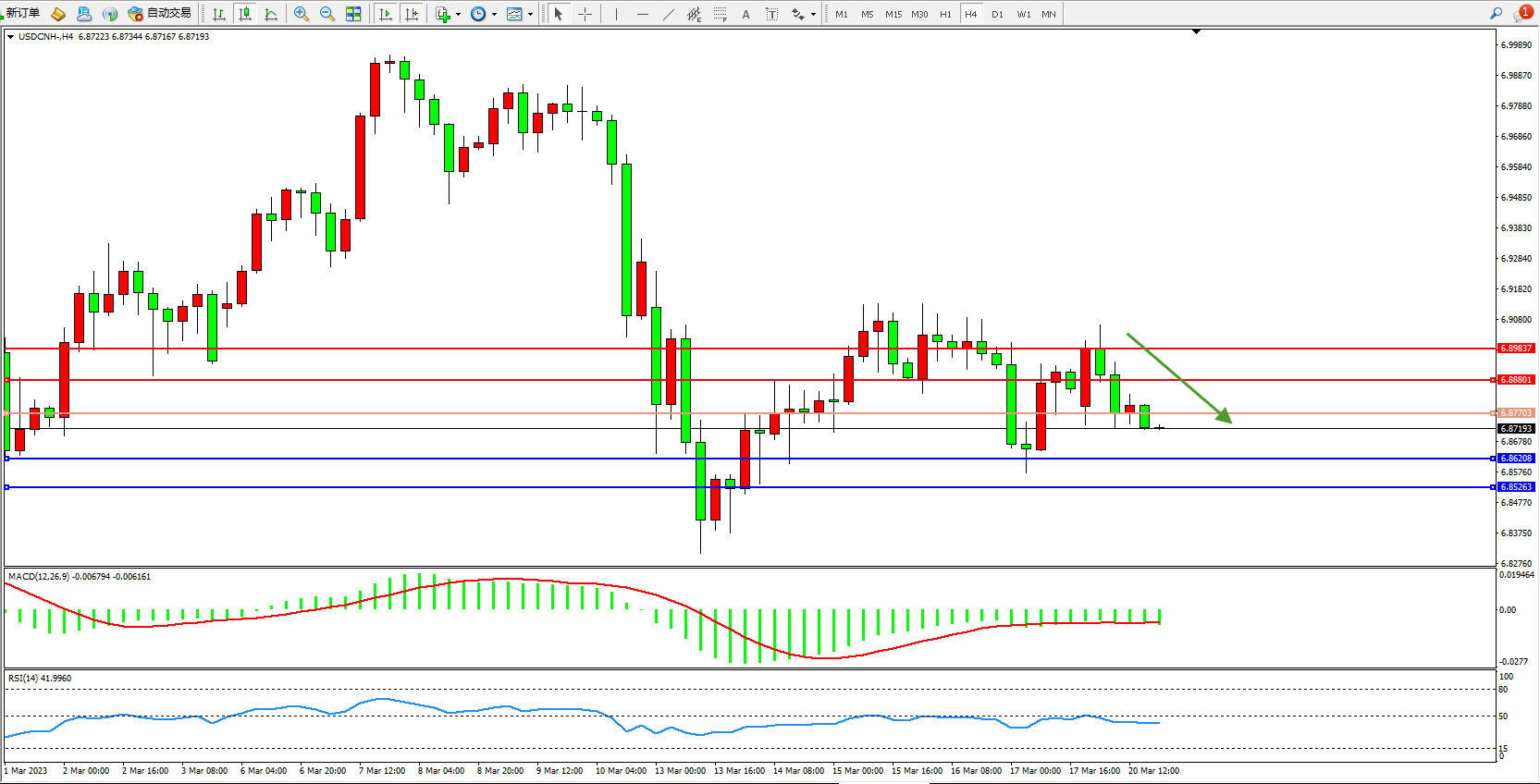 备选策略:6.87703上方看涨,目标6.88801  6.89837