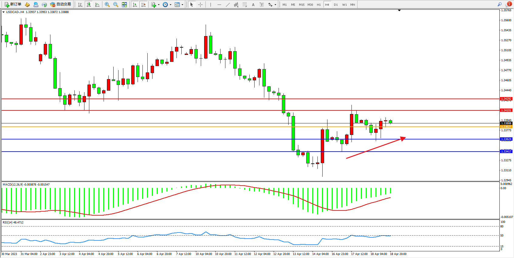美元加元USDCAD——4小时K线图显示: