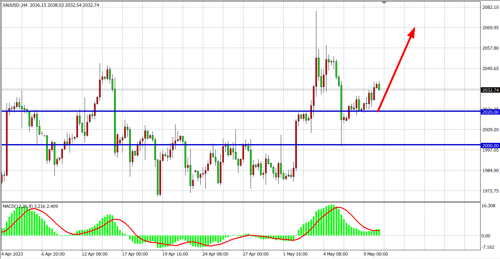 4小时图看,黄金在2010之上继续反弹,目前支撑进一步上移至2020附近,同时MACD在零轴上开始温和放量,有望延续涨势,日内在2020之上看涨,目标2050-2070附近。