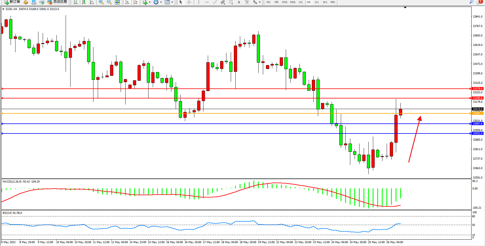 道琼斯指数DJ30——4小时K线图显示: