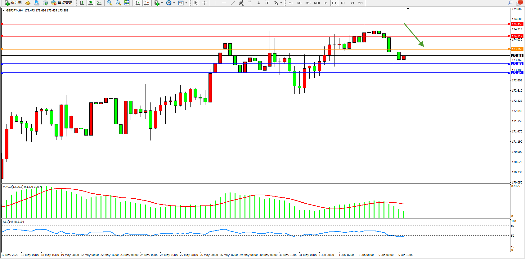 交易策略:173.760下方看跌,目标173.351 173.104