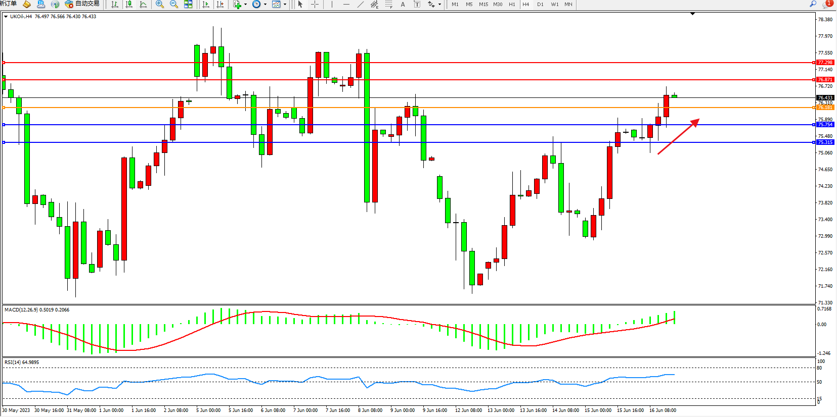 交易策略:76.181上方看涨,目标76.871 77.298