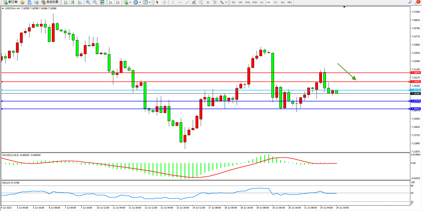 交易策略:7.18746下方看跌,目标7.17519 7.16654