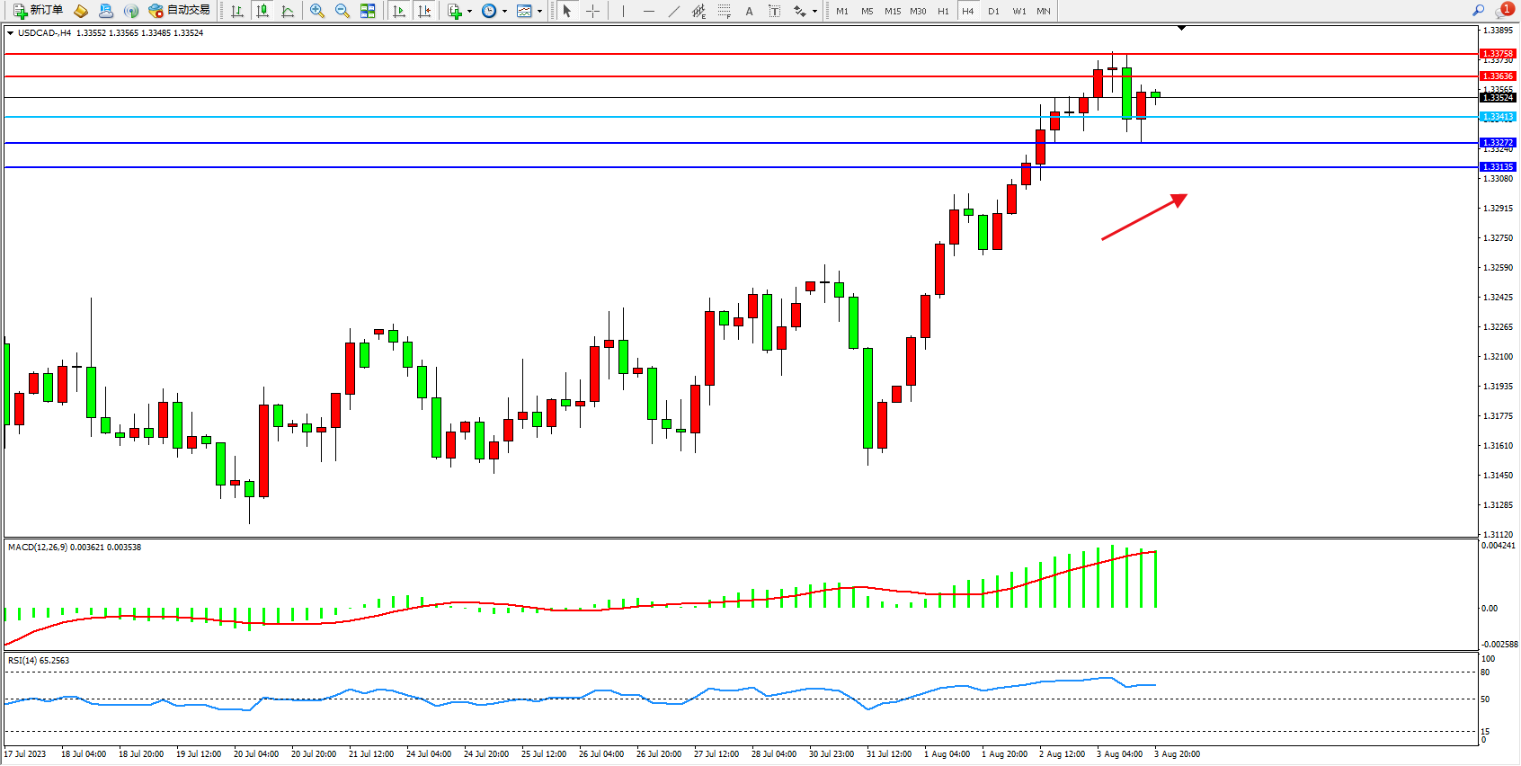 美元加元USDCAD——4小时K线图显示: