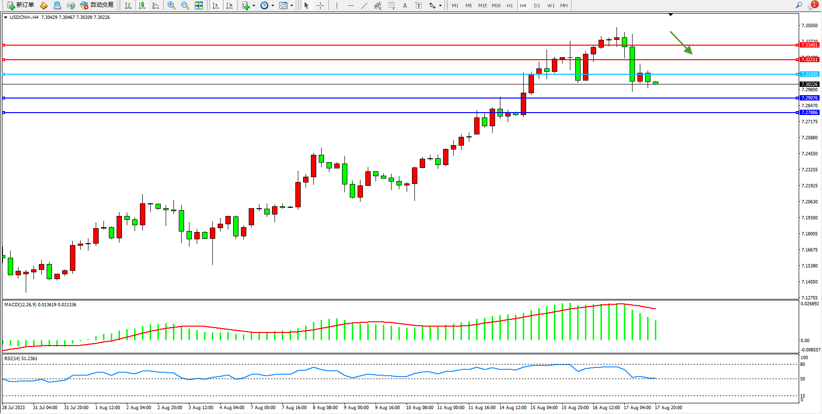 交易策略:7.31020下方看跌,目标7.29076 7.27886