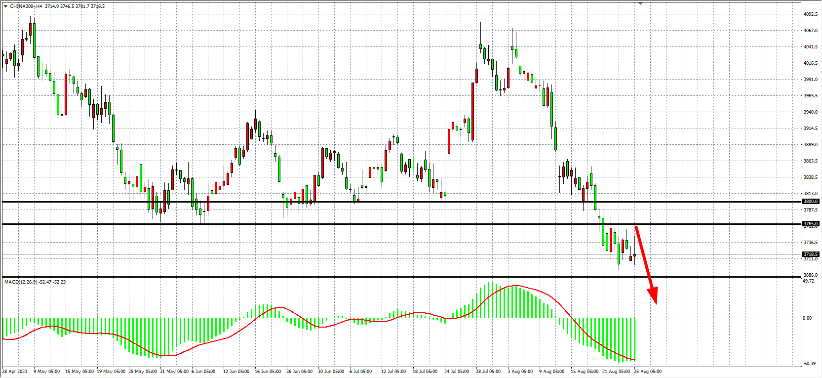 4小时图看,沪深300在3700关口徘徊,MACD量能仍在零轴下放大,空头趋势延续,阻力继续关注3765-3800。