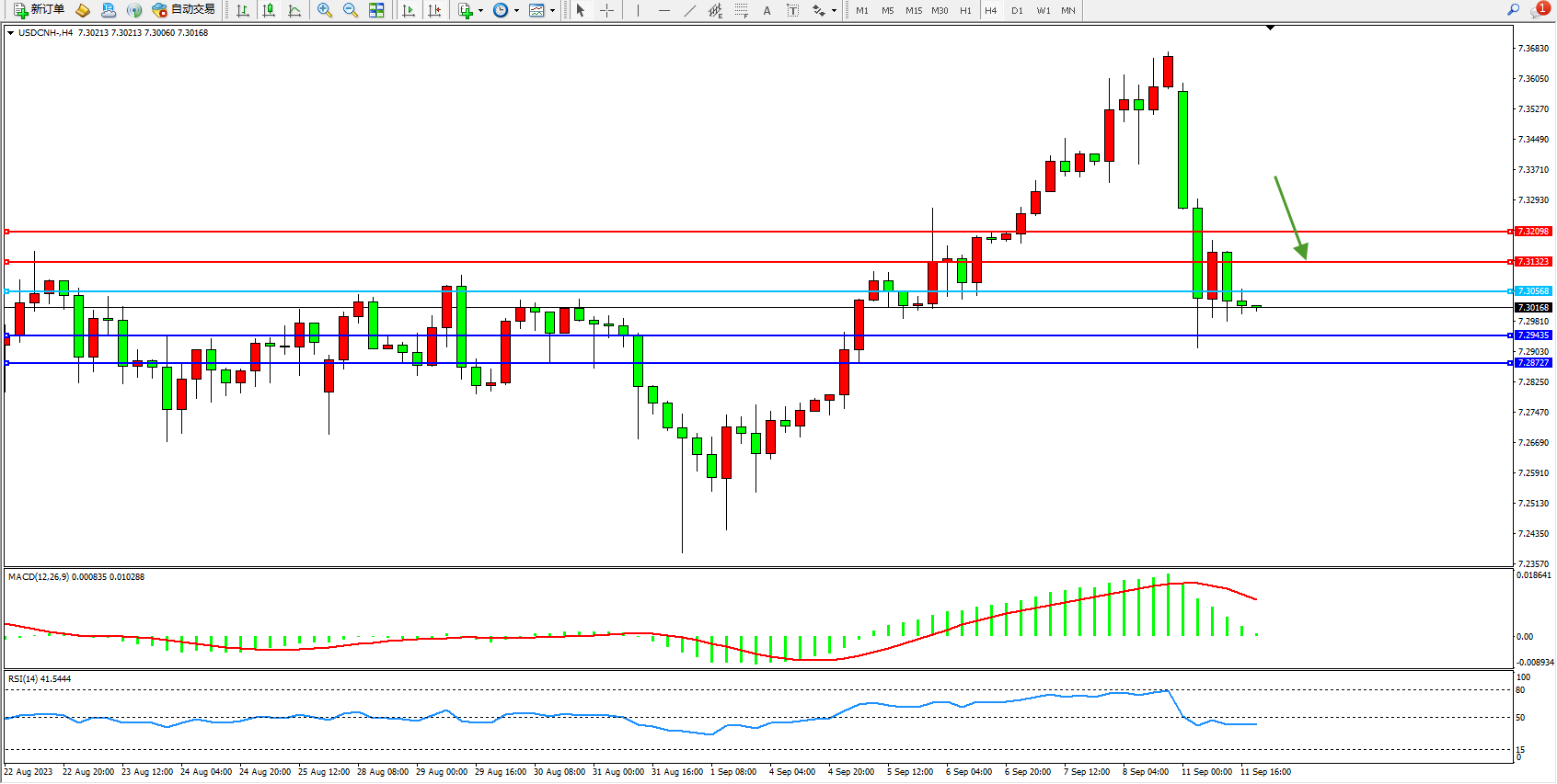 美元人民币USDCNH——4小时K线图显示:
