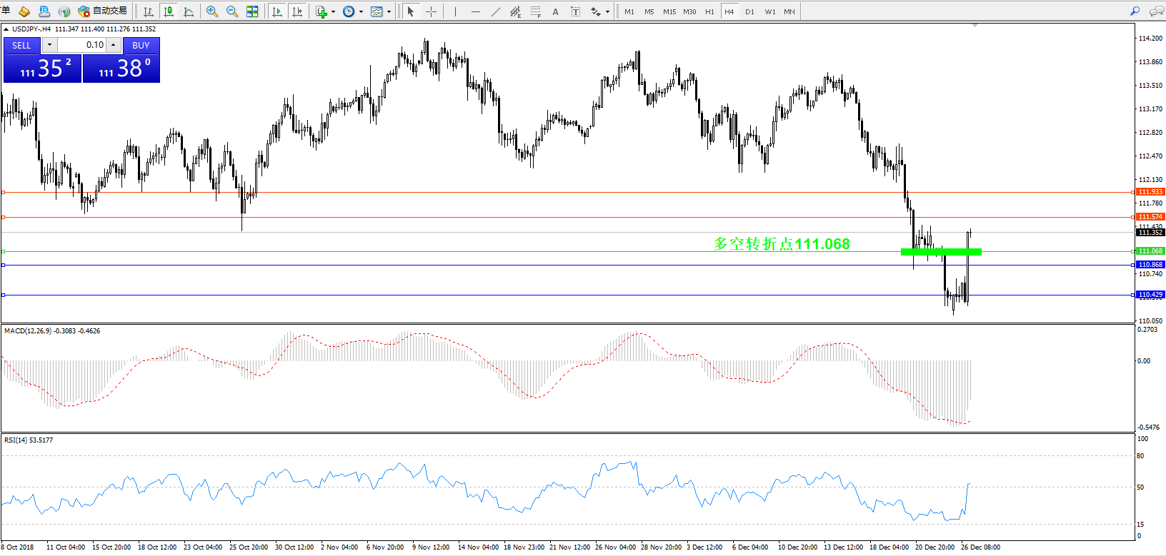 备选策略:111.068下方看跌,目标110.868、110.429