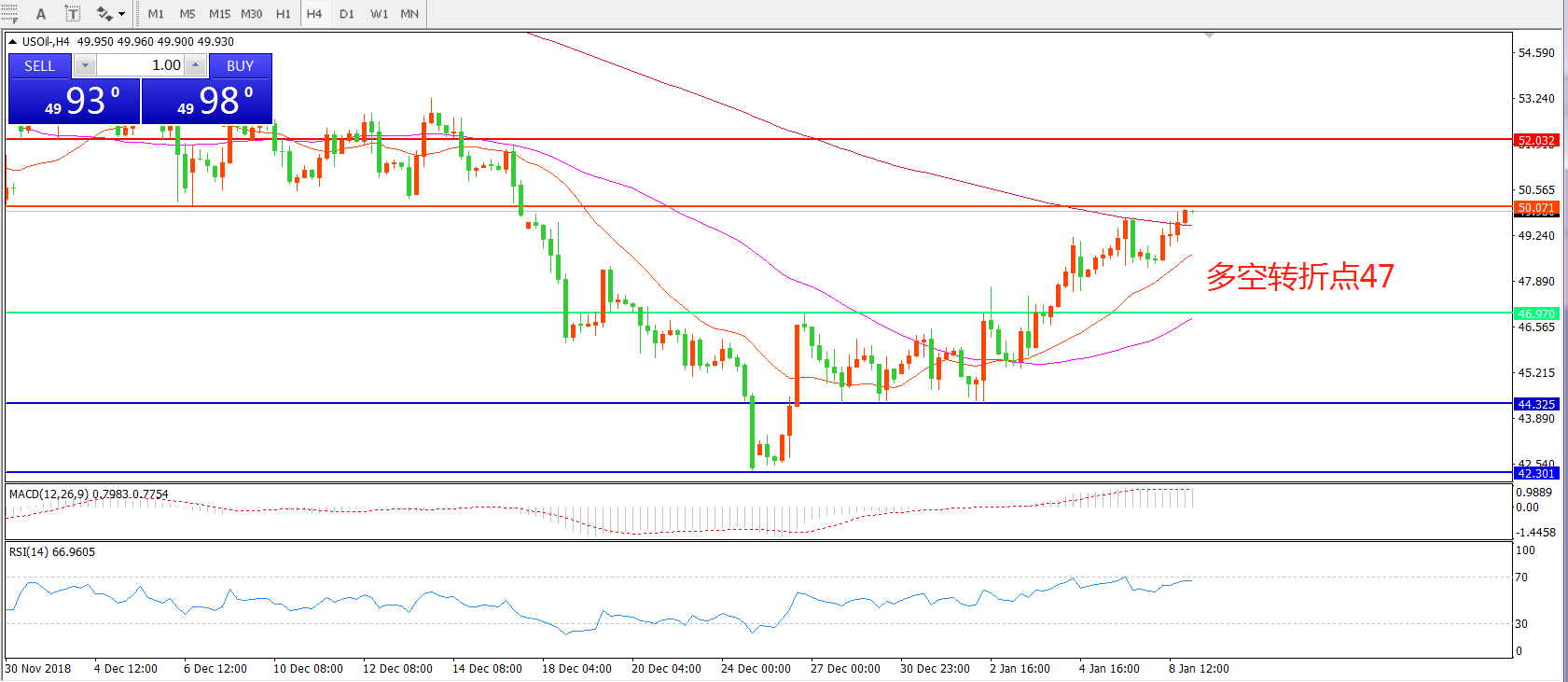 4小时图看,油价站稳47美金后稳步上行, 21与55均线形成金叉,200均线被突破站稳,MACD红柱增加,RSI指标拐头,日内反弹概率较大。
