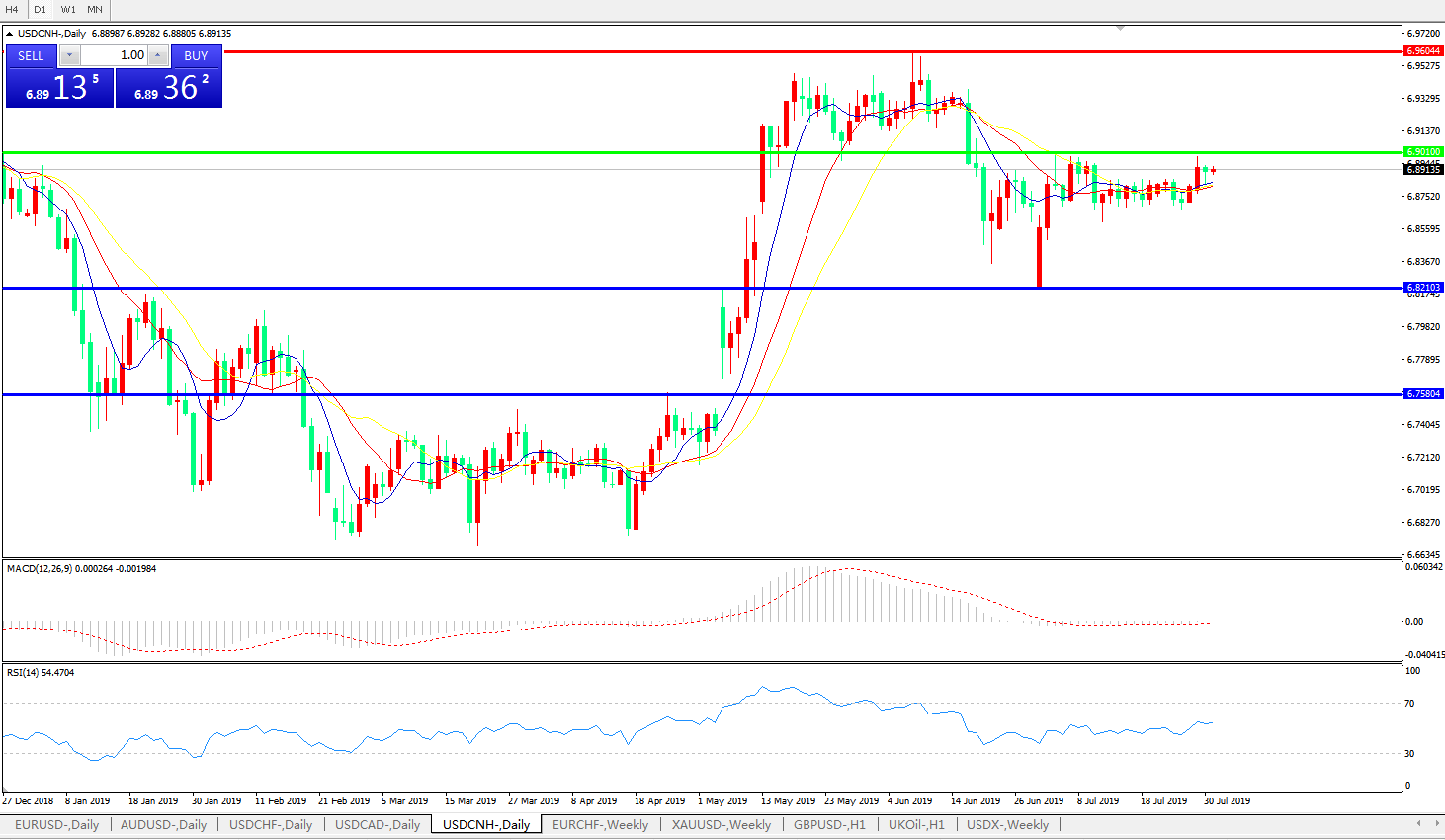 交易策略: 在6.9010之下,看跌,目标价位为6.8210,然后为6.7580。