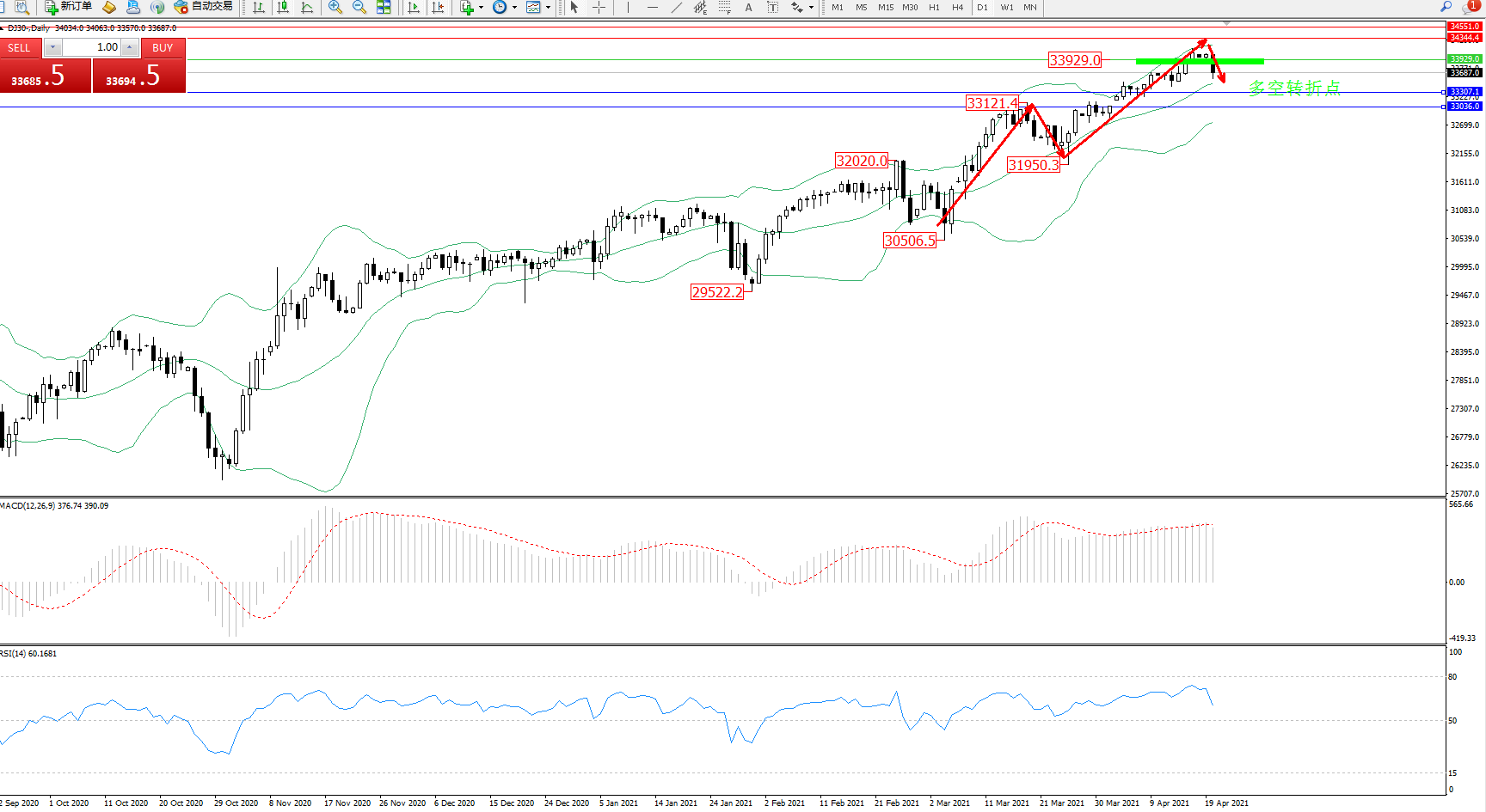 交易策略:33929下方看跌,目标33307、33036
