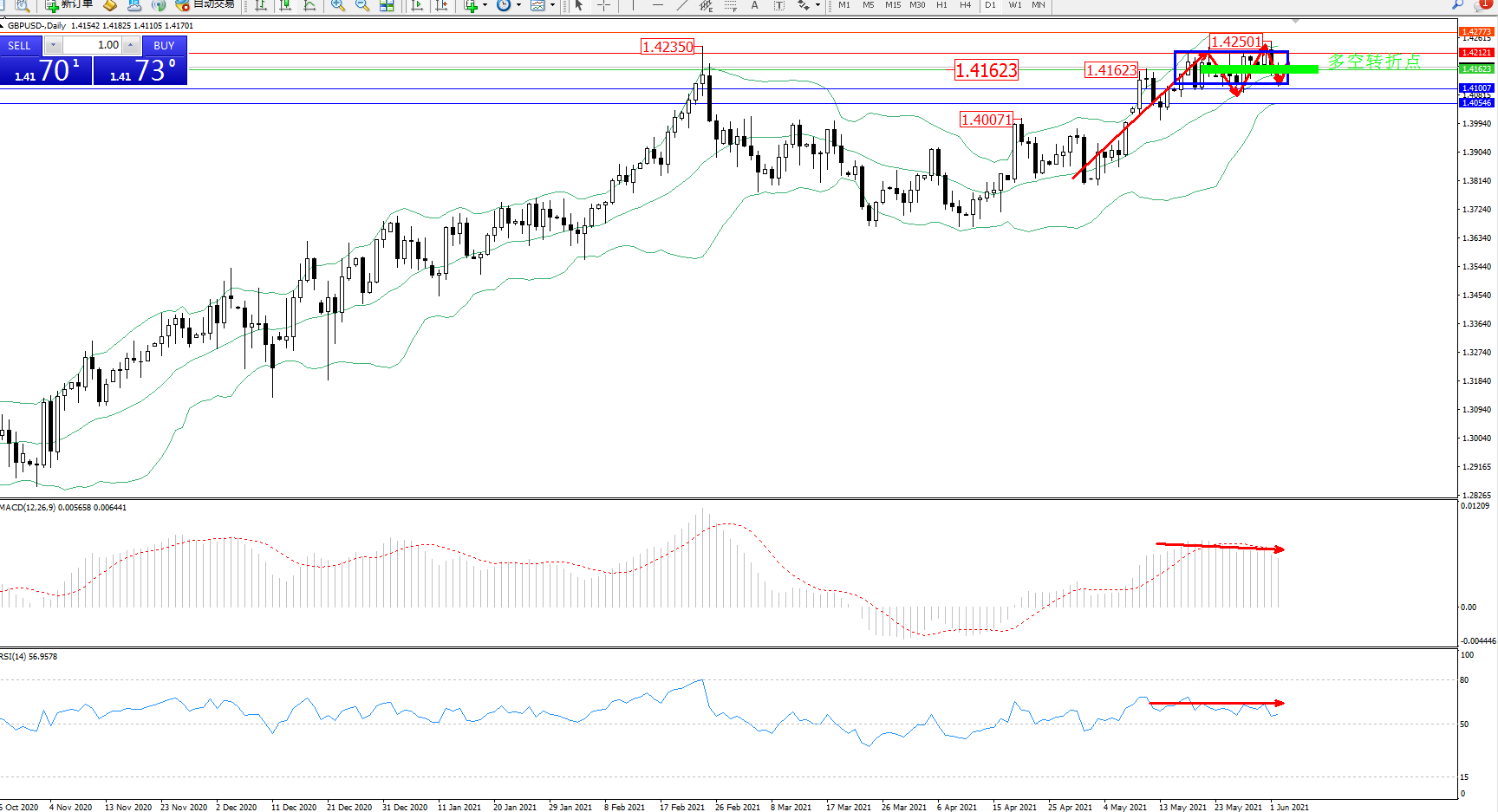 备选策略:1.41623上方看涨,目标1.42121、1.42773