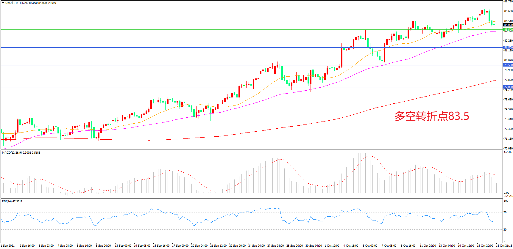 4小时图看,油价冲高回落,整体呈现高位震荡形态,均线系统呈多头排列,MACD红柱缩短,RSI指标走平,日内震荡上行概率较大。
