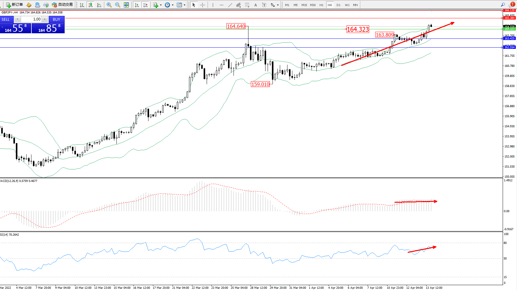 交易策略:164.323上方看涨,目标165.384、166.120