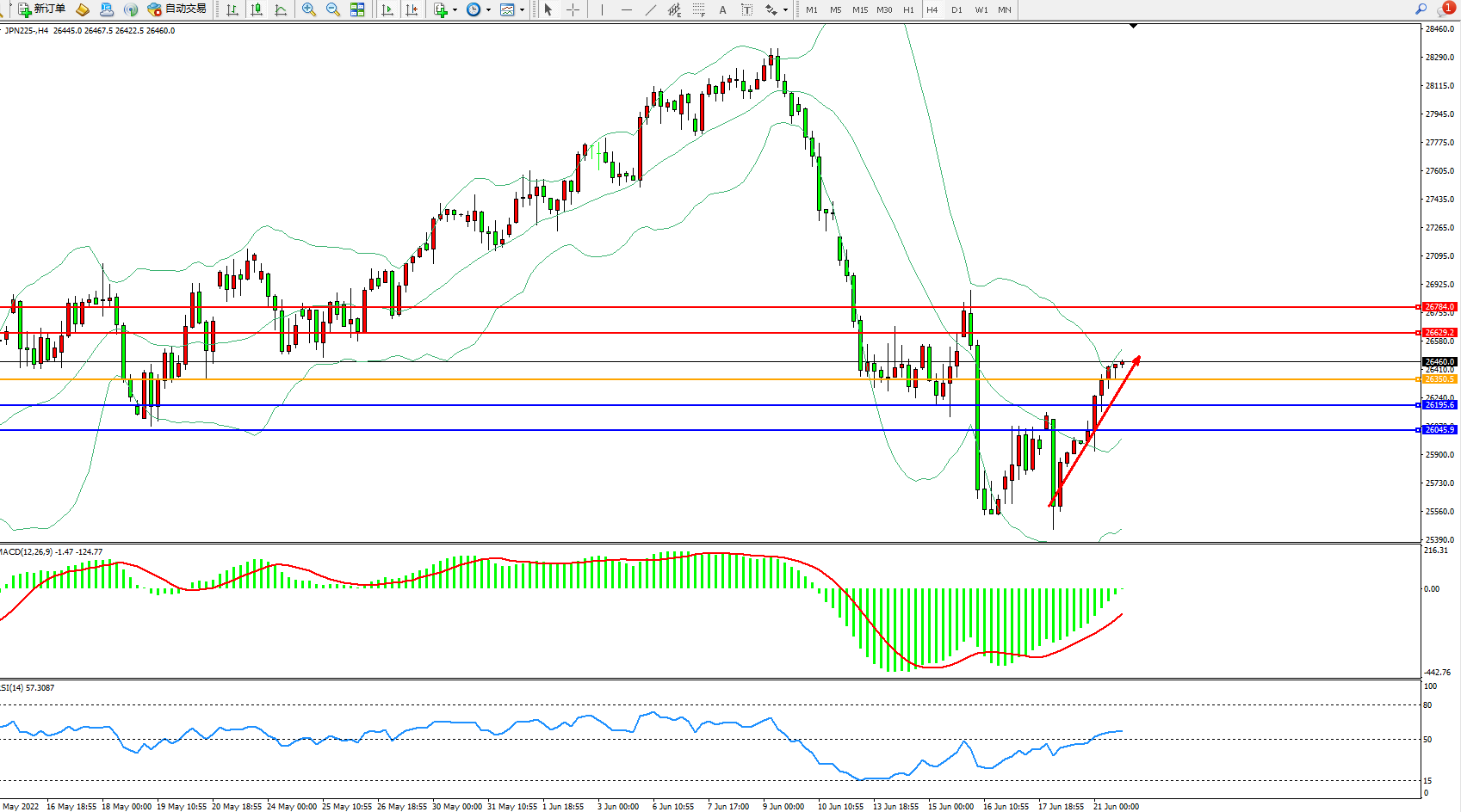 日经225指数6月21日(周二)收盘上涨498.28点,涨幅1.93%,报26269.50点。日本首相岸田文雄:货币政策影响汇率,将考虑总体决策对小型企业的影响,现在不应该调整货币政策,通过影响小企业的利率和住房抵押贷款,货币政策对经济有很大的影响。