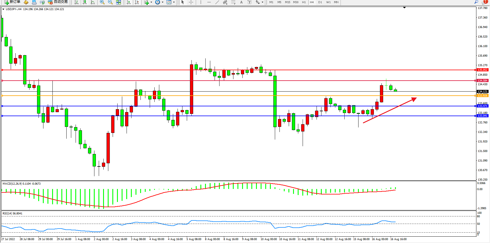 交易策略:133.926上方看涨,目标134.584、135.052