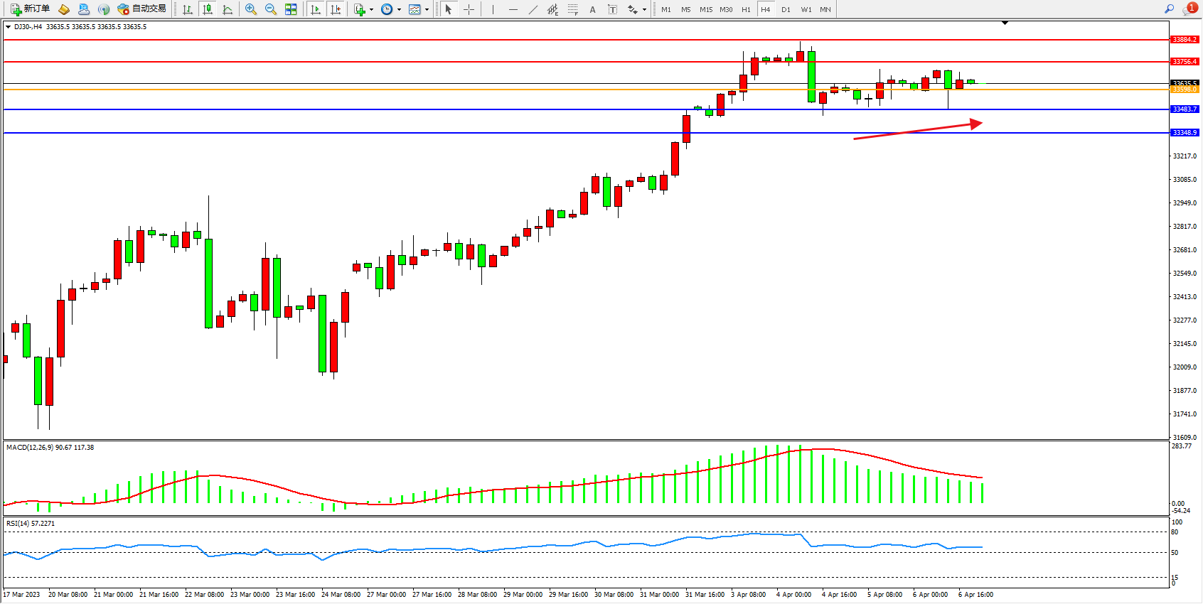 道琼斯指数DJ30——4小时K线图显示: