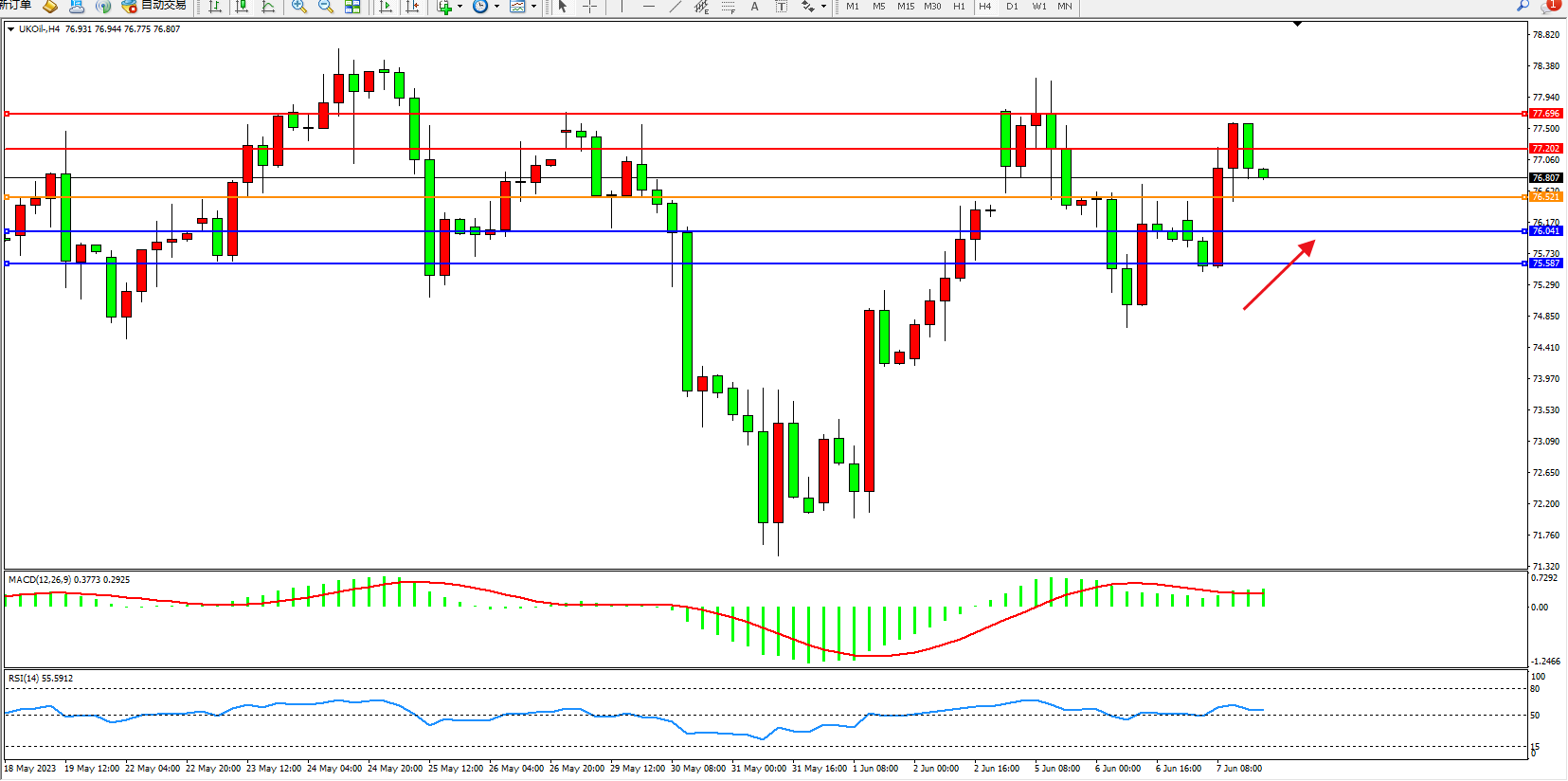 交易策略:76.521上方看涨,目标77.202 77.696