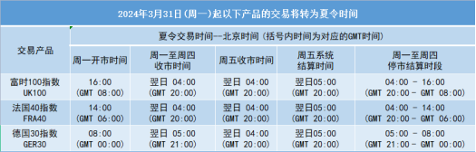 因应美国时区于2024年3月10日(周日)与欧洲时区于2024年3月31日(周日)分别开始转为夏令时间, 本公司各产品交易时间将以下表安排调整为夏令时间,敬请留意。